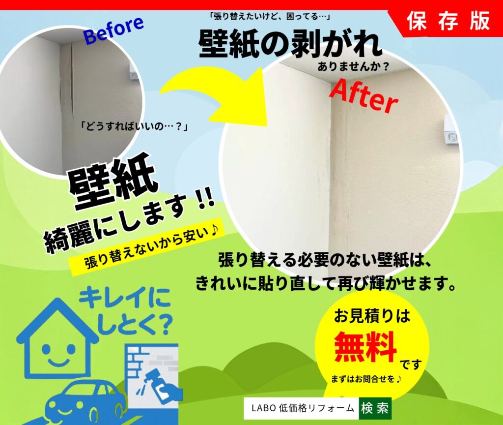 「もうダメかな」と思っていた壁紙も、 実はまだまだ使えるんです! 張り替えずに“貼り直すだけ”で、ここまで見違える